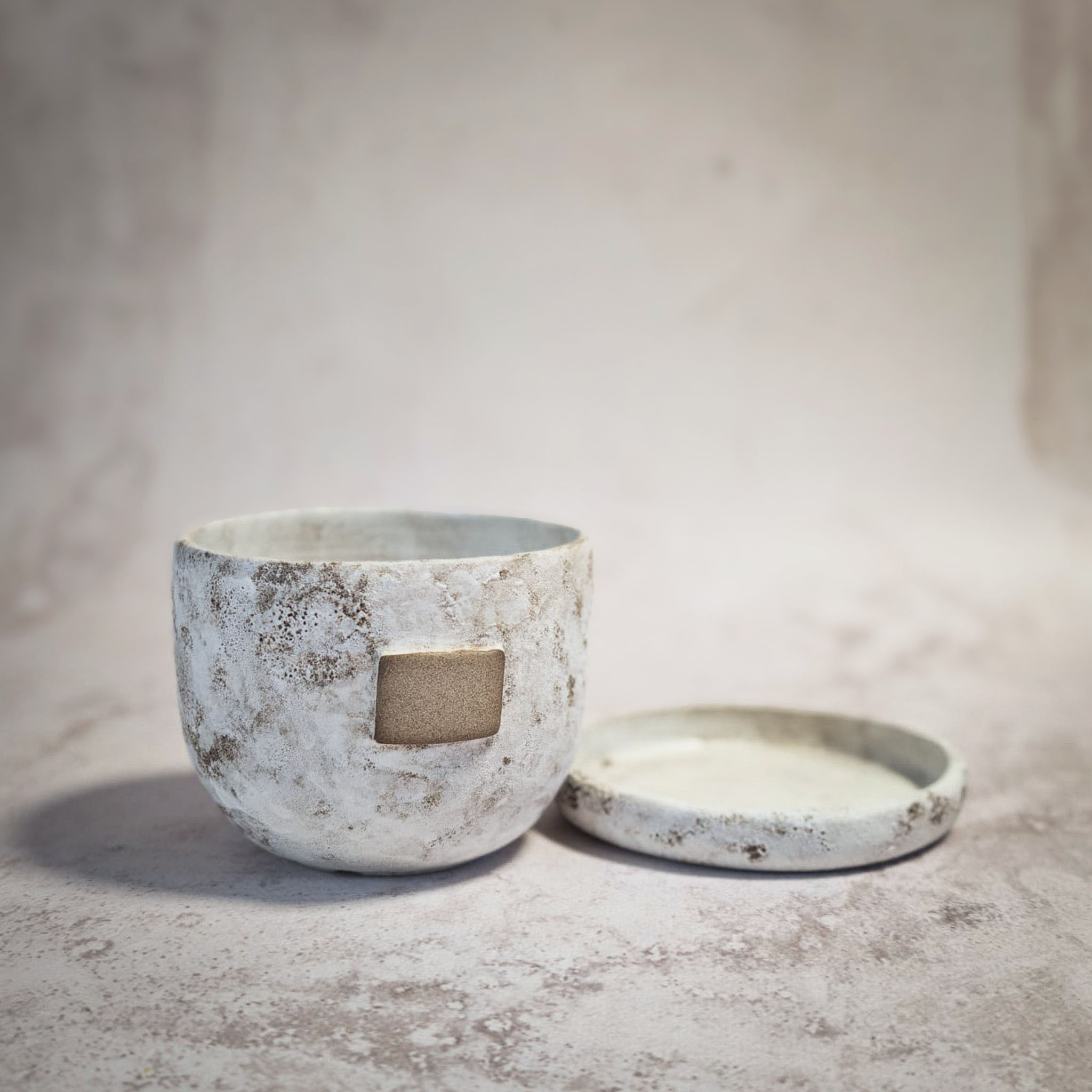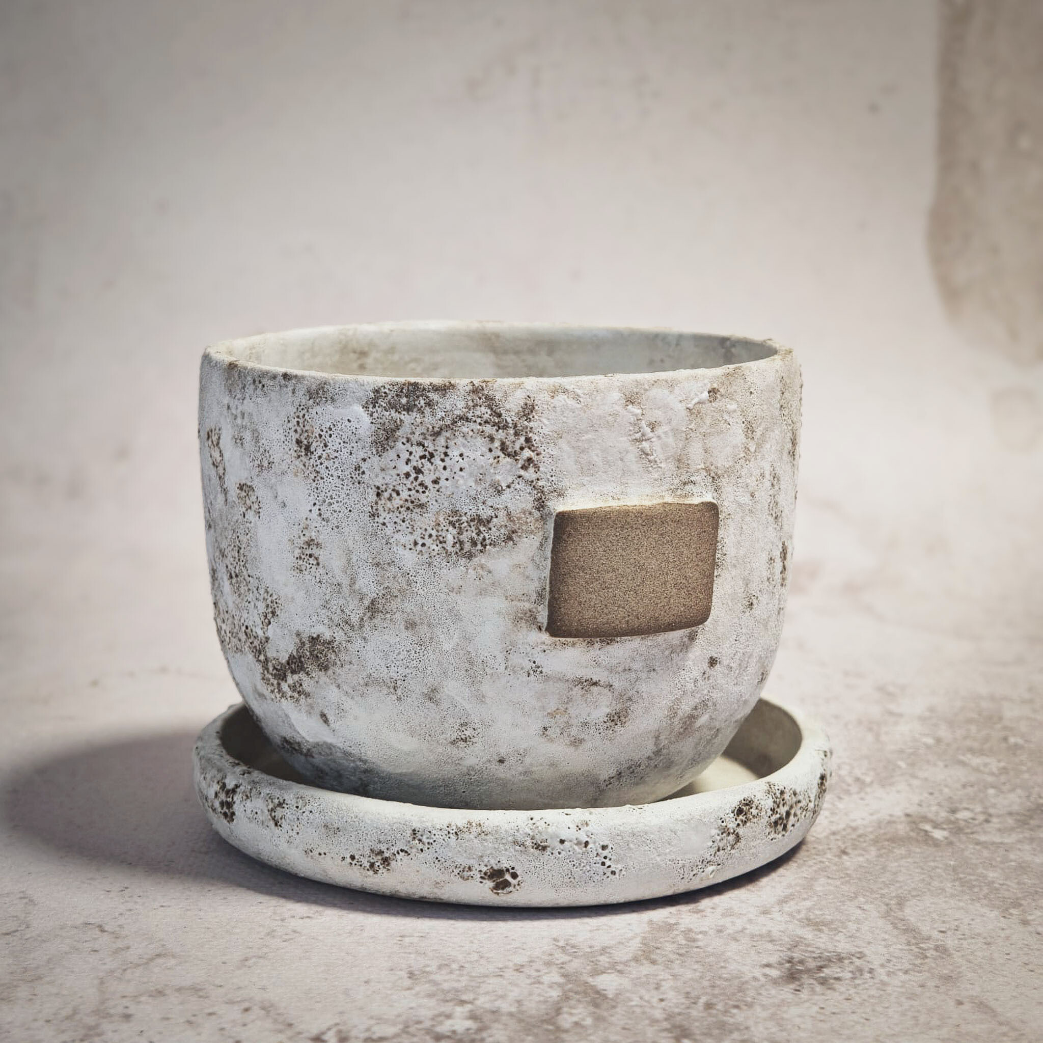 Doniczka posiada dziurki odpływowe oraz miejsce na kredowy podpis.