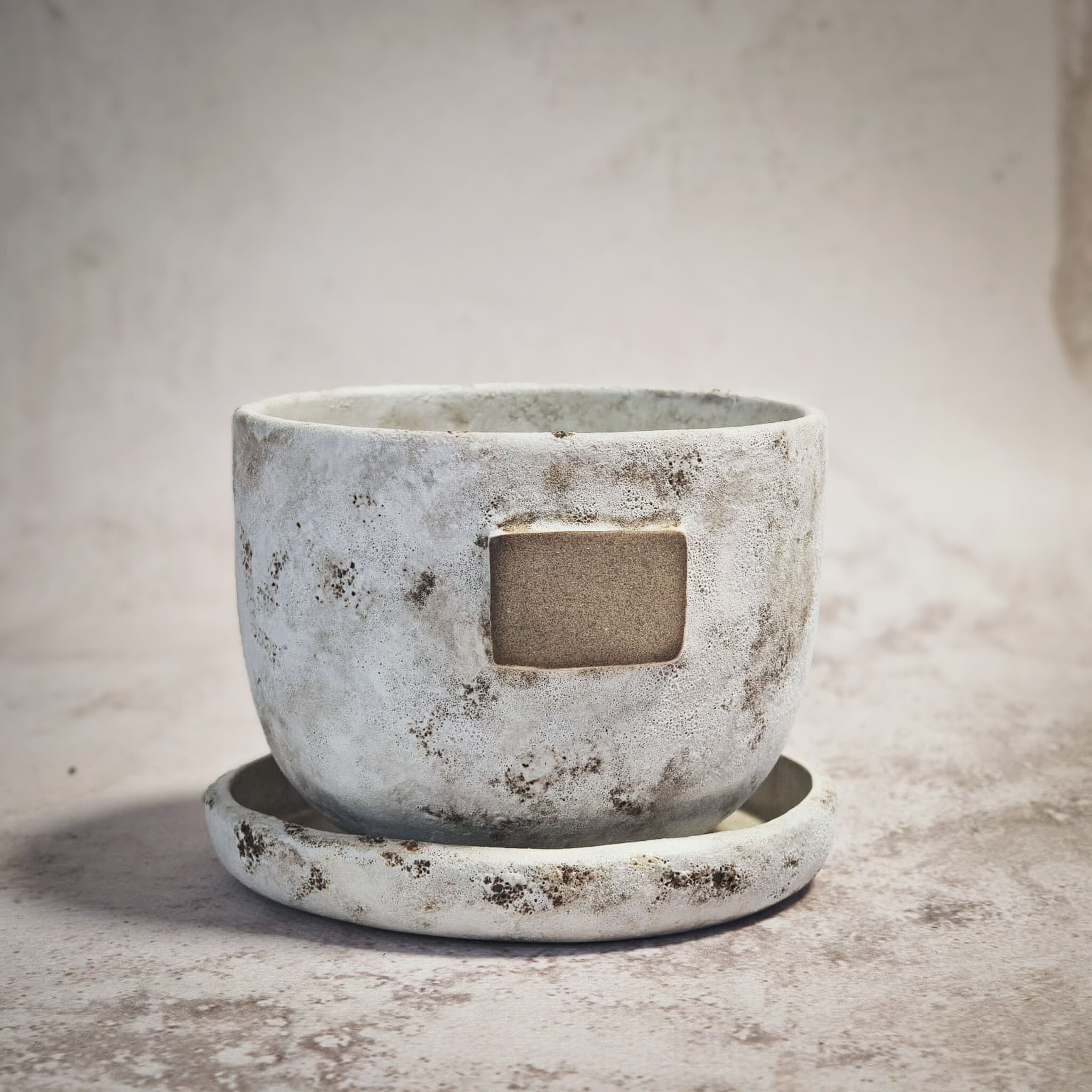 Doniczka posiada dziurki odpływowe oraz miejsce na kredowy podpis.